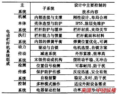 国外先进技术水平电动栏杆的主要技术指标如下:输人电源AC220V,50Hz;电机额定功率60w;有效扭矩20N;栏杆长度范围3—6m;起落时间(可调)1—3s;寿命次数500万次;运行噪声≤30dB。