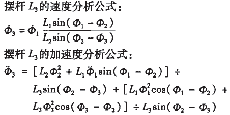 在启动时系统惯量必须考虑摇杆加速度变化,使电机克服负载加速转动所消耗的功率成为主要因素。通过对连杆机构的速度 分析 和加速度 分析 ,确定启动时负载轴上的最大角速度和最大角加速度。如图所示: