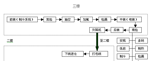 2、充氟检漏线:在该段生产线完成室外机抽真空后的充氟检漏及返修工序。
