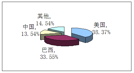 世界酒精产量最大的前三个国家,美国、巴西、中国,增长速度为18%、4%、47%。三国酒精产量的总和已经占据了国际市场份额的85.46%,其中美国的市场份额为38.37%,巴西的市场份额为33.55%,中国的市场份额为13.54%。
