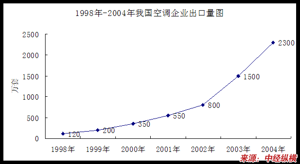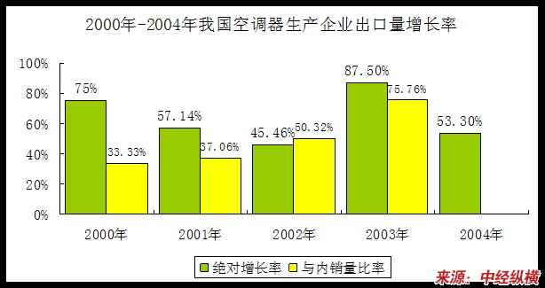 2004年,中国空调出口2300万台,内销出货2400万台。换句话说,不计社会库存,2004年中国空调 行业 工厂滞销库存就突破1000万台。在内销市场竞争激烈而陷于薄利的情况下,出口无疑是降低成本、提升规模的重要途径,尤其是对一些产能相对庞大的整机工厂来说,出口市场一直是作为平衡生产峰谷差距的重要手段。而在一部分合资品牌全球生产体系中,中国基地的作用也越来越重要。所以,2004年度全国空调企业的出口总量继续保持高速增长,全冷冻年度达到了2680万台,超过了本年度2560万台的内销总量,对比2003年度增长率为78.7%,比去年增长率低8.8个百分点,但仍高于今年内销增长率。而从增长的绝对量来看,对比2003年度净增量达1180万台,以此可见外销市场在2004年度中的爆发力。