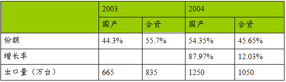 在对出口总量的结构进一步 分析 后我们发现,与2003年合资品牌占据主流不同的是,2004年国产品牌开始占据主导地位,而且两年的份额正好发生对调。其实合资品牌的出口量增长也比较迅速,但是相对国产品牌无论是相对量还是绝对量都处于弱势。