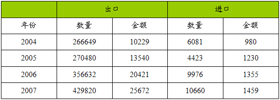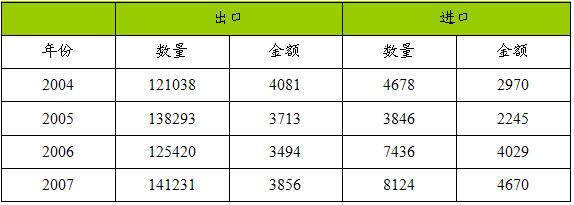2004-2007年我国假牙(义齿)进出口数量和金额(千克,千美圆)