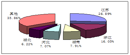 从销售收入前100名企业所在省市和子 行业 分布看,江苏以34.31%的销售分额处于化学药品制剂 行业 的首位,化学原料药的销售收入主要来自河北、山东和黑龙江,生物制药销售收入的37.73%由浙江企业提供,而医疗器械工业的销售收入主要来自北京、江苏、辽宁和山东,中成药销售收入则主要来自重庆、江西和天津。