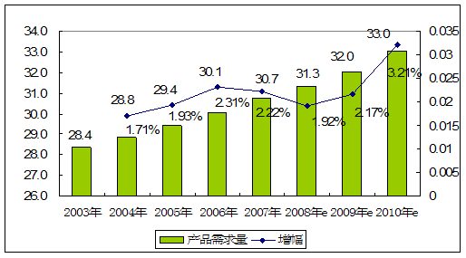 从我国聚乙二醇市场的需求情况中可以看出,目前市场保持一个稳定缓慢的需求增长态势,2007年市场需求量为30.7万吨,与2003年相比需求量增长仅1.7万吨,增长率为8.42%,年增长率为2%左右。其原因主要是聚乙二醇的生产供应不足导致了产品的进一步发展,影响了产品用途及适用范围的继续扩大,因此市场上产品需求增长缓慢。预计未来几年聚乙二醇市场需求依然保持稳定的发展趋势,其市场需求增长率将在2%~3%左右变化。