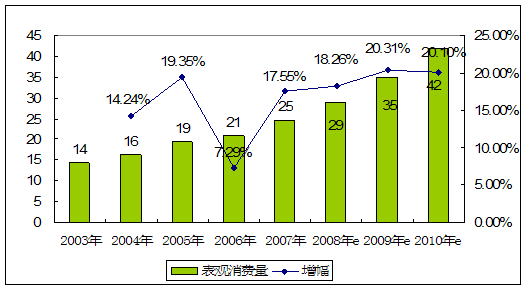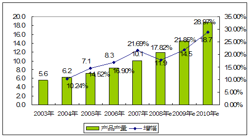 我国聚乙二醇自2004年以来产品产量增长迅速,年增长率超过15%。2004年产量6.2万吨,比2003年增长10.24%,2005年产量7.1万吨,比上年增长0.9万吨,增幅14.52%。而到2007年产量达到了10.1万吨,其产量增幅超过了20%,2007年我国聚乙二醇的产量相当于2003年产量的1.8倍。由此可见我国聚乙二醇 行业 的生产规模及产品产能在短短四年的时间内增长迅速。由于近年来我国聚乙二醇 行业 规模的不断扩大和市场庞大的需求,可以预见,未来我国聚乙二醇 行业 的产量增加空间依然很大,根据其现有生产规模和其下游 行业 需求状况,预计在2008-2010年,我国聚乙二醇产量依然保持快速的增长,到2010年其产量将达到18.7万吨。