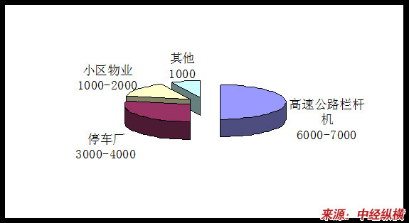 目前对栏杆机的需求主要有小区物业、停车厂、收费站等,目前收费站对栏杆机的智能化程度较高,高速公路栏杆机市场每年市场需求规模量达到6000~7000台左右,停车场市场每年栏杆机市场需求规模达到3000-4000台,而新建小区对栏杆机的需求达到1000-2000台,其他需求约1000台。