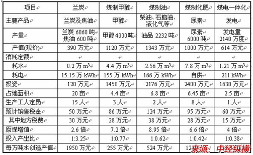 以每加工转化1万吨原煤为基数,大概测算了兰炭(未包括煤焦油深加工、焦炉煤气综合利用等下游产业)、煤制甲醇、煤制油、煤制化肥以及煤电一体化5个不同 行业 之间的产值、耗水、投资等经济技术数据。根据对比 分析 ,兰炭相对于其他煤化工和煤转化 行业 ,产值最小、耗水最少、投资最小、定员最多,表明兰炭产业虽然原煤转化程度较低,但投入产出比高,形成了稳定的产业链,对地方经济的贡献很大;同时,兰炭产业具有明显的耗水少、投入产出比高、产业关联度强的特点,在目前水资源日益短缺的背景下,与煤制油、煤制甲醇等大型煤化工产业相比,具有独特的发展优势。