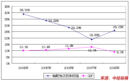 从图中可以看出,输配电及控制设备 行业 产值增幅与与国家宏观经济环境相关程度较大,随着GDP的增加,产值增加, 行业 产品总产值增长率高于国家GDP增长率, 行业 前景看好。