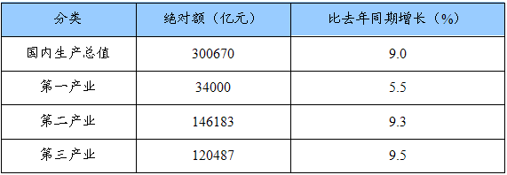 初步核算,全年国内生产总值300670亿元,比上年增长9.0%。分季度看,一季度增长10.6%,二季度增长10.1%,三季度增长9.0%,四季度增长6.8%。分产业看,第一产业增加值34000亿元,增长5.5%;第二产业增加值146183亿元,增长9.3%;第三产业增加值120487亿元,增长9.5%。
