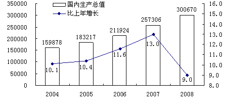 初步核算,2008年全年国内生产总值300670亿元,比上年增长9.0%。分产业看,第一产业增加值34000亿元,增长5.5%;第二产业增加值146183亿元,增长9.3%;第三产业增加值120487亿元,增长9.5%。第一产业增加值占国内生产总值的比重为11.3%,比上年上升0.2个百分点;第二产业增加值比重为48.6%,上升0.1个百分点;第三产业增加值比重为40.1%,下降0.3个百分点。