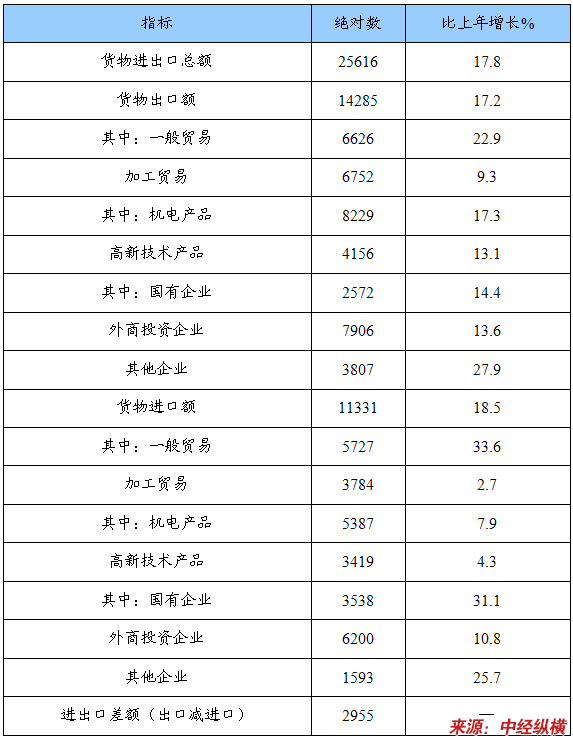 全年货物进出口总额25616亿美元,比上年增长17.8%。其中,货物出口14285亿美元,增长17.2%;货物进口11331亿美元,增长18.5%。进出口差额(出口减进口)2955亿美元,比上年增加328亿美元。
