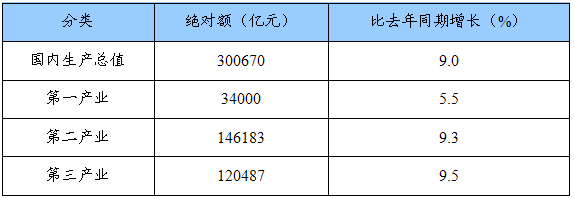 初步核算,全年国内生产总值300670亿元,比上年增长9.0%。分季度看,一季度增长10.6%,二季度增长10.1%,三季度增长9.0%,四季度增长6.8%。分产业看,第一产业增加值34000亿元,增长5.5%;第二产业增加值146183亿元,增长9.3%;第三产业增加值120487亿元,增长9.5%。