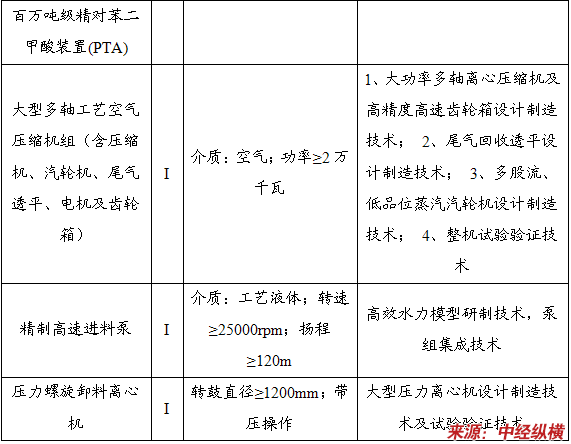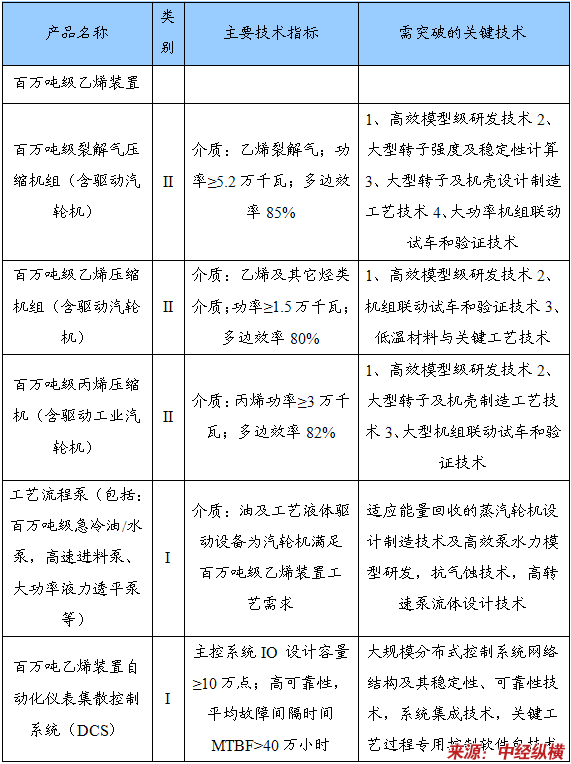 石化产业。以石化产业调整和振兴 规划 确定的工程为依托,以千万吨级炼油、百万吨级大型乙烯、对苯二甲酸(PTA)、大化肥、大型煤化工和天然气输送液化储运等成套设备,大型离心压缩机组、大型容积式压缩机组、关键泵阀、反应热交换器、挤压造粒机、大型空分设备、低温泵等为重点,推进石化装备自主化。