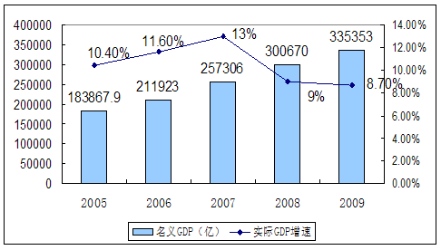 2009年国内生产总值335353亿元,比上年增长8.7%。分产业看,第一产业增加值35477亿元,增长4.2%;第二产业增加值156958亿元,增长9.5%;第三产业增加值142918亿元,增长8.9%。第一产业增加值占国内生产总值的比重为10.6%,比上年下降0.1个百分点;第二产业增加值比重为46.8%,下降0.7个百分点;第三产业增加值比重为42.6%,上升0.8个百分点。