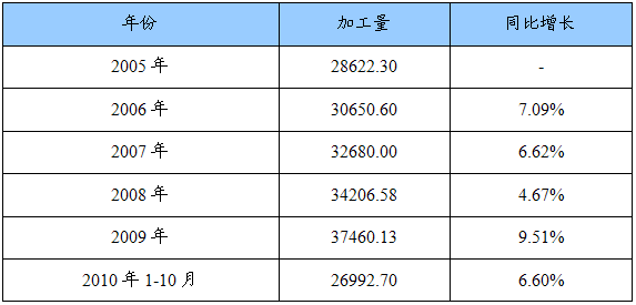 2005-2010年下游 行业 1(原油)加工量增长情况统计表