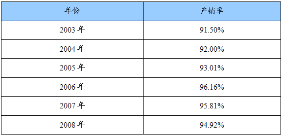 工业产品产销量是反映工业产品生产实现销售的程度。即生产与销售衔接程度,这一比率越高,说明产品符合社会现实需要的程度越大,反之则小。从2003-2008年我国输配电及控制设备 行业 产销量来看,产销量均在90%以上,其中2006年达到了96.16%,同时可看出“十一五”期间产销量高于“十五”期间。