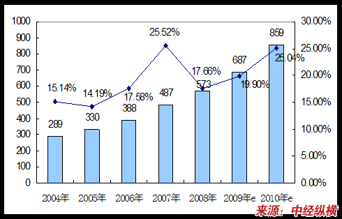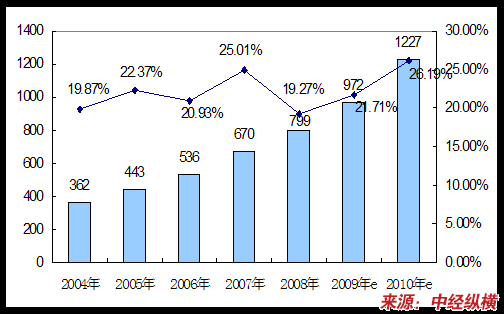 我国食品工业总产值年均增长10%以上,但仍与社会需求间存在较大差距,这就为速冻食品、保鲜食品的发展提供了较大的空间,从而使得我国冷藏设备市场容量迅速扩大。随着经济的发展,人民生活水平的提高,餐饮旅游业迅猛发展。餐饮与食物冷冻冷藏、保鲜密切相关,为冷冻冷藏设备制造业提供了发展的空间。速冻、方便食品需求增加带动速冻保鲜设备市场需求的增加,随着恩格尔系数的逐步下降,消费方式的改变,用于文化、娱乐、健康、公益方面的消费逐步提升,对于食物的需求人们更注重营养、健康、安全、卫生、味美等方面,为速冻食品、方便食品提供了更广阔的市场空间,同时也拉动了各类速冻设备、小包装成品、半成品保鲜设备的发展。除此之外,医药、医疗、生物工程等 行业 的发展也使得冷藏设备的市场容量进一步增大。2005年开始我国冷藏设备市场容量就以超过20%的速度快速增长,到2007年市场容量增加到670亿元。受金融危机的影响,2008年下半年市场需求增速出现下滑,全年市场需求增速下降到19.27%,而未来餐饮业、食品工业、医疗 行业 的快速发展,将使得越来越多冷冻、保鲜产品出现,预计2009年、2010年随着我国下游市场对冷藏设备需求的进一步增加,市场需求将逐渐恢复,到2010年市场需求达到1227亿元。