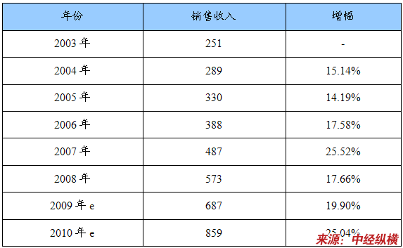 2003—2010年冷藏设备 行业 销售收入及预测表