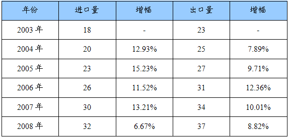虽然近些年我国冷冻技术有了很大进步,国内相当一部分产品已达到世界先进水平。但国内高档产品的产量始终缺乏。加上下游消费领域对产品性能要求的提高,使得国内高档产品的需求市场增长较快。长期以来从日本、韩国等进口高档产品。而在出口方面,近些年我国中低档的产品以其价格优势向东南亚、西欧等国的发展较快。从具体的数据上看,2003年我国冷藏设备的进口量为18亿元,出口量为23亿元,2004年进口量为20亿元,出口量为25亿元,同比分别增长了12.93%、7.89%。2006年进口量增幅为11.52%、出口量增幅为12.36%,到2007年进出口量分别为30、34亿元,比上年分别上涨13.21%、10.01%。而2008年由于受到全球金融危机的影响,冷藏设备进出口贸易增长都有所放缓。