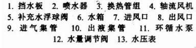 蒸发式冷凝器主要由换热器、水循环系统及鼓风机三部分组成。传热部分的换热器是一个蛇形管组,装在一个立式箱体内,箱体的底部为水盘。