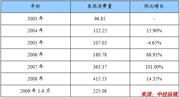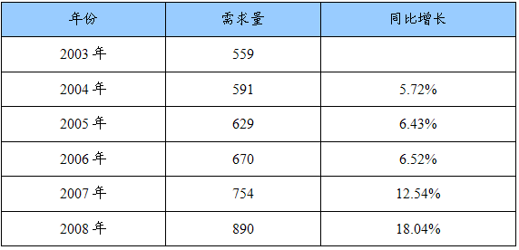 2003-2008年煤沥青全球需求量统计