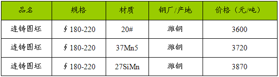 目前市场上经销商出货价格已经明显低于钢厂管坯出厂价格,市场倒挂情况严重,经销商急于出货套现,也是价格一路下滑的原因之一。受整体管坯价格下滑影响,今日钢厂迫于无奈,也下调了管坯出厂价格。东北地区受其他地区管坯价格不断下跌影响,也下调了管坯出厂价格,由于下游用户对管坯后市信心不足,钢厂表示,成交低迷的情况短时期内难以得到改善,后期管坯价格可能仍有下滑趋势。天津钢铁20#连铸管坯规格为φ150-200执行价格6550元/吨,37Mn5规格为φ150-200市场报价6650元/吨。唐山兆宇20#连铸坯φ150-350报价6250元/吨,45#规格φ150-350报价6300元/吨。承德建龙20#轧制坯φ58-80报价6490元/吨,φ85-120报价6540元/吨。华东地区,江阴兴澄轧制坯20CrMo规格为φ20-100现款价8400-8500元/吨。淮钢特钢连铸20#规格φ160-500现款价格6300-6500元/吨。宝通钢铁连铸20#规格φ160-200现款价6550元/吨,无锡雪浪连铸20#规格φ150-280现款价6520元/吨,轧制坯20#规格φ50-110现款6570元/吨。寿光巨能轧制管坯45#规格为φ16-150现款价6150-6250元/吨;山东鲁丽轧制管坯20#规格为Φ50-150承兑价格为6400-6500元/吨。东北地区,凌源钢铁20#规格为φ50-100轧制管坯现款价格为6260元/吨,45#规格为φ50-100轧制管坯现款价格为6250-6300元/吨。通化钢铁20#规格为φ50-100轧制管坯承兑价为6230元/吨,连铸20#规格为φ135-160承兑价格为6200元/吨,45#规格为φ135-160承兑价格为6250元/吨,37Mn5规格为φ135-160执行价格为6300元/吨。