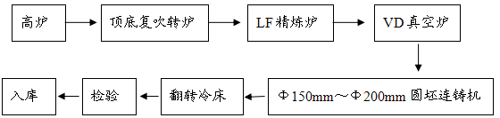 高炉→顶底复吹转炉→LF精炼炉→VD真空炉→Φ150mm~Φ200mm圆坯连铸机→→检验→入库