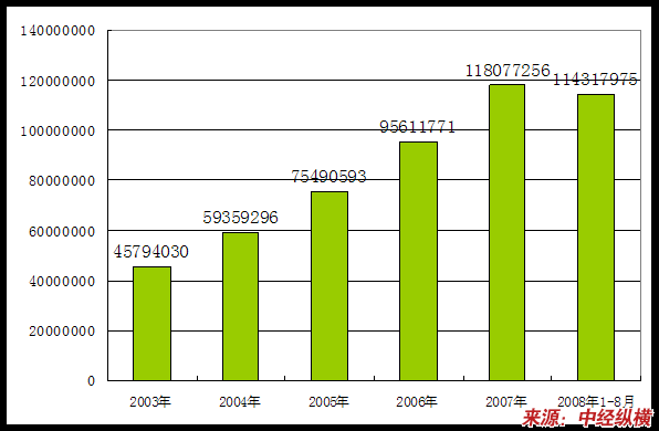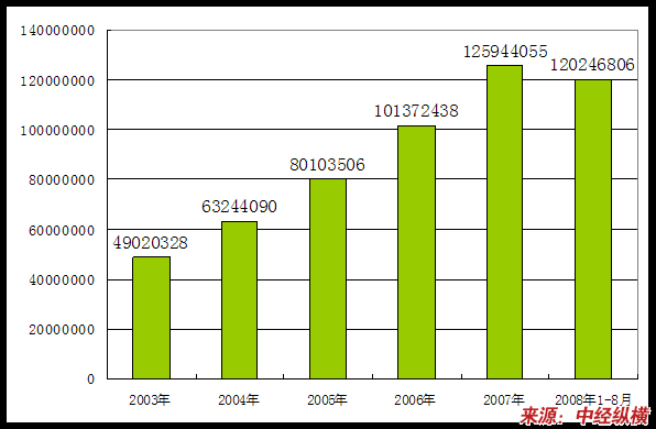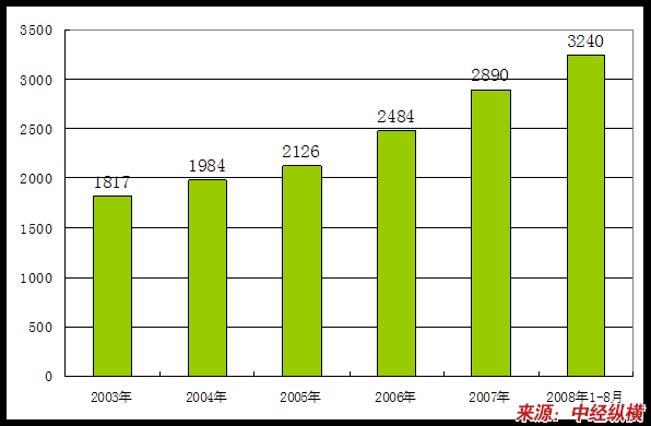 3、2003年-2008年1-8月产品销售收入变化状况 分析