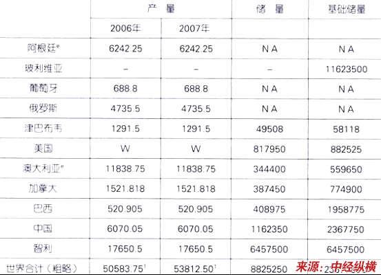 2006年统计的全球查明的锂资源(以Li2O计)为:储量为882.52万t,储量基础为2637.75万t。主要集中在智利、中国、巴西、加拿大、和澳大利亚等国家。按全球2006年的锂产品产量5.06万t(Li2O计),现有锂储量足以保证全球生产近200年(没有包括海水中的锂资源)。在世界7个国家的19个大型锂矿床中,有4个矿床的锂资源量(以Li2O计)超过100万t,它们是玻利维亚的乌龙尼盐湖,智利的阿塔卡玛盐湖,阿根廷的翁师雷穆埃尔托(Hombre Muerto)湖和中国青海的查尔汗盐湖。