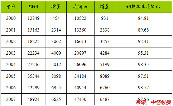 2000~2007年中国粗钢产量、连铸坯产量和连铸比的增长