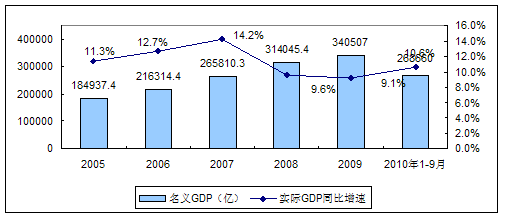 2005年-2010年3季度我国GDP增长变化图