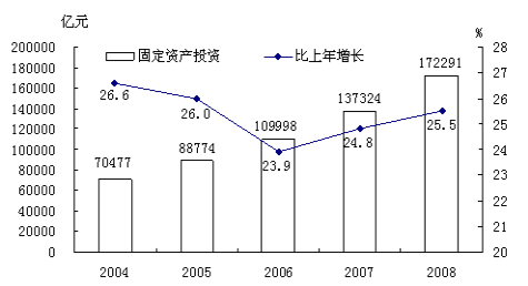 全年全社会固定资产投资172291亿元,比上年增长25.5%。分城乡看,城镇投资148167亿元,增长26.1%;农村投资24124亿元,增长21.5%。分地区看,东部地区投资87412亿元,比上年增长20.9%;中部地区投资45384亿元,增长32.6%;西部地区投资35839亿元,增长26.9%。