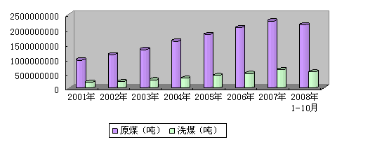 近年来,我国原煤和洗煤产量逐年增长,2007年原煤产量达到23亿吨,洗煤产量为6.24亿吨,2008年前10各月分别达到21.55亿吨和5.5亿吨(见下图)。随着煤炭需求量及开采量的不断增加,对洗煤设备的数量和技术要求也越来越高。