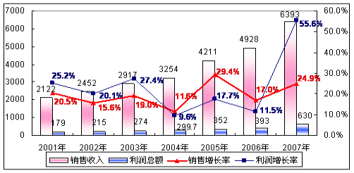 2001-2007年全国医药工业销售收入及利润总额增长状况