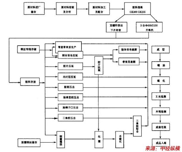 全钢子午线轮胎的主要制造工艺分为:密炼:胶料的混炼-压出:胎面、胎侧、垫胶、胎圈胶芯型胶压延:薄胶片、内衬层钢丝压延:胎体、带束层、子口包布帘布外胎成型-外胎硫化-外胎成品的生产检验等。