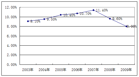 2003-2009年我国合成橡胶消费量及同比增长统计表