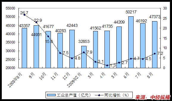 2008年8月-2009年8月月度工业总产值及增长率