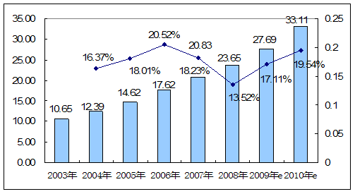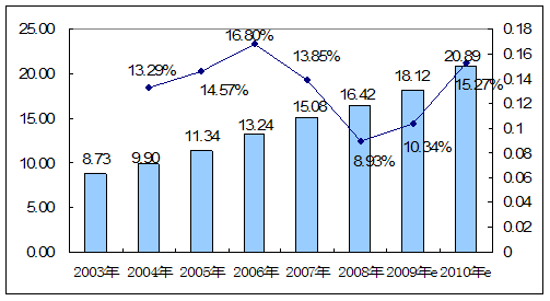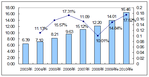 2003—2010年美纹纸胶带产品市场需求及预测图