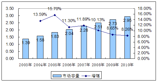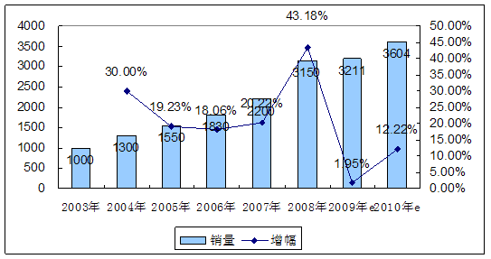 2003-2010年我国发酵木瓜酒销量统计及预测图