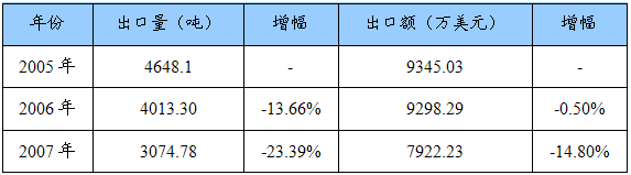 2005年我国野生菌出口量和出口额分别为4648.18吨和9345.03万美元,2006年我国野生菌出口量和出口额分别为4013.30吨和9298.29万美元,2007年的野生菌出口量和出口额分别为3074.78吨和7922.23万美元,以上数据不包括盐渍野生菌、速冻野生菌、冷冻干燥产品以及己加工为罐头的清水、调味野生菌罐头等产品。