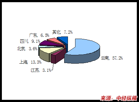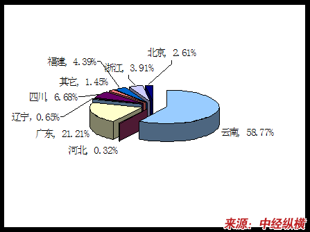 我国野生菌主要分布在云南及四川地区,其余省市分布较少。由于云南是我国野生菌类的主要出产地,其产量占到全国野生菌产量大约83%的份额。
