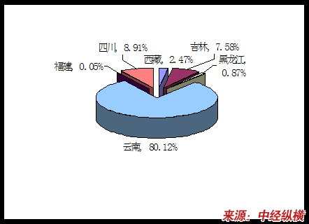 我国野生菌(鲜松茸、干牛肝菌、块菌)出口主产地集中在云南、四川、西藏、吉林,其中云南省鲜松茸出口占全国80%以上,牛肝菌干片占全国58%,块菌占全国45.6%。