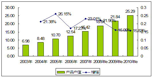 虽然目前实木百页门占整个木质建筑装饰用品市场的比例还比较低,但是我国实木百页门的生产在几年间已经有了长足的进步, 行业 产值绝对量不断提高,从2003年的6.98亿元上升到了2007年的15.42亿元,产品产值平均年增幅超过了20%。预计2008年-2010年,我国实木百页门产品产量还将继续增加,年产值有望突破25亿元。
