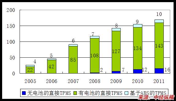 2004年全球TPMS(包括基于ABS的间接TPMS)一共制造1700万套,其中绝大多数针对欧美前装市场。2005年TPMS市场增长34%,达到2600万套,2006年增长83%,达到4700万套,2007年增长约96%,达到9200万套,2008年之后增长趋于平稳,预计到2011年会突破1.69亿套。TPMS市场目前的主角是采用电池的直接系统,无电池直接系统可能于2008年与ESP系统一道面向高端汽车推出。