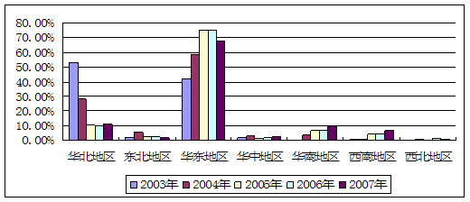 2003年-2007年中国毛毯 行业 生产区域变化情况