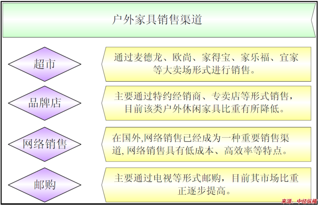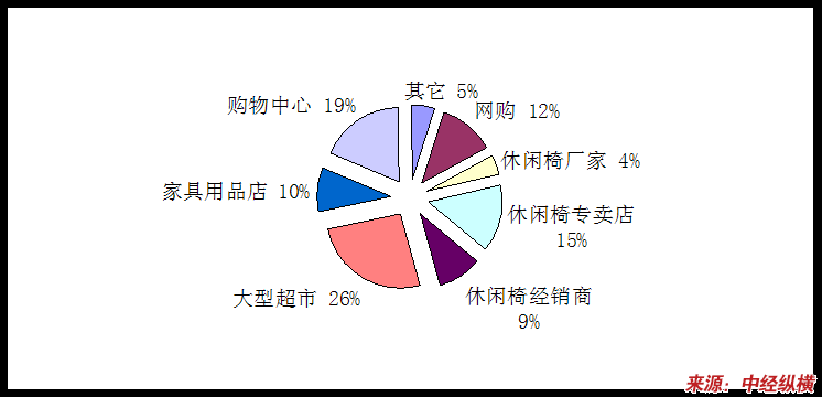 折叠式户外休闲椅的最终消费者主要是家庭个人用户和经营酒店、咖啡馆、餐馆、展览会、旅游景点等休闲场所的商业客户,因此,这类产品也具有多种销售渠道。在国外,超市、品牌店、网络销售、邮购四类销售渠道的销售额占全部销售额的70-80%。这四种销售渠道具体表现为: