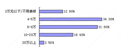 从客户在装饰费用的预算中,有66.1%客户的装饰预算是4-9万,调查显示,购房大部分客户还是工薪阶层和一般白领人士,首次置业装饰消费,更加注意自身经济承受能力;同时,有18.4%的客户装饰预算是10-20万之间,这部分客户以二次置业为主,而20万以上的装饰费用仅占2.5%。