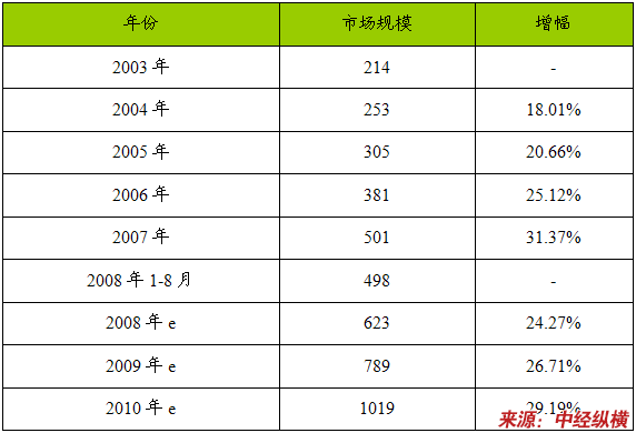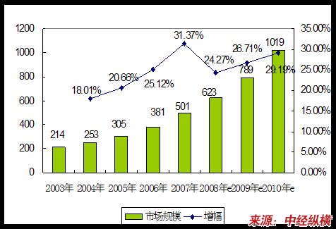 近几年我国银行电子支付密码器系统的市场规模及增长率发展较快,2003年我国银行电子支付密码器系统的市场规模为214万台,2004年市场规模量为253万台,比上年增长了18.01%,2005年市场规模为305万台,比上年增长了20.66%。2007年市场规模为501万台。增幅为31.37%,为历年来的最高增幅。银 行业 务、电子银行、支票业务的快速发展使得我国银行电子支付密码器系统的需求增长迅速。未来随着电子商务应用范围的扩展及与银 行业 务的密切联系,将促使银 行业 务的快速发展。我国银 行业 务安全意识的进一步提高及业务范围的扩展将会使银行电子支付密码系统的应用更加普及。但受金融危机的影响,2008年下半年市场规模增速出现下滑,全年市场规模增速下降到24.27%,而预计2009年、2010年随着我国下游市场对银行电子支付密码器系统需求的增加,市场规模将逐渐恢复,并且仍将保持较快的增长速度,到2010年市场规模达到1019万台。