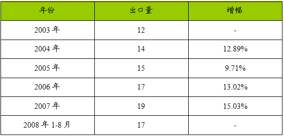 由于银行电子支付密码系统的适配性,目前我国银行电子支付密码产品基本都是采用国内产品,几乎无进口产量。而出口量也很少,2003年我国银行电子支付密码器系统出口量12万台,2004年出口量14万台,比上年增长12.89%。到2007年产品出口量达到19万台,比上年增长15.03%。虽然总体上看出口增长速度较快,但出口量依然很少。